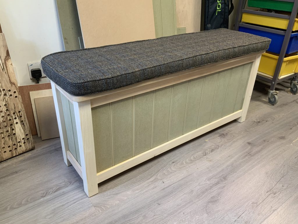 This was made to measure for an entrance porch. Pictured before it was painted. I had a cushion made for it using genuine Harris Tweed at the customers request.
