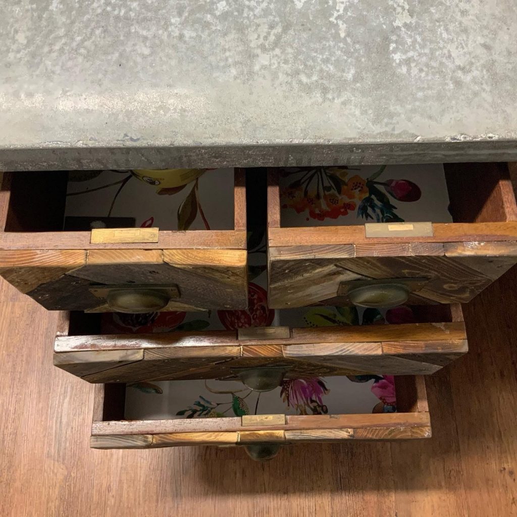 The owner of the salon asked me to design a reception desk to fit the available space. He wanted it to have concrete counter tops and use reclaimed timber for the cladding.